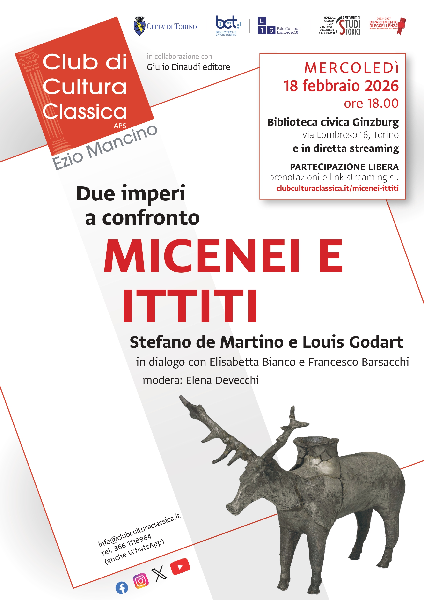 Mercoledì 18 febbraio alle ore 18:00 presso la Biblioteca Civica Ginzburg di Torino i Professori Stefano de Martino e Louis Godart presentano "Micenei e ittiti. Due imperi a confronto" edito da Einaudi nel 2025. Gli autori dialogano con i Professori Elisabetta Bianco e Francesco Barsacchi; modera l’incontro la Prof.ssa Elena Devecchi.